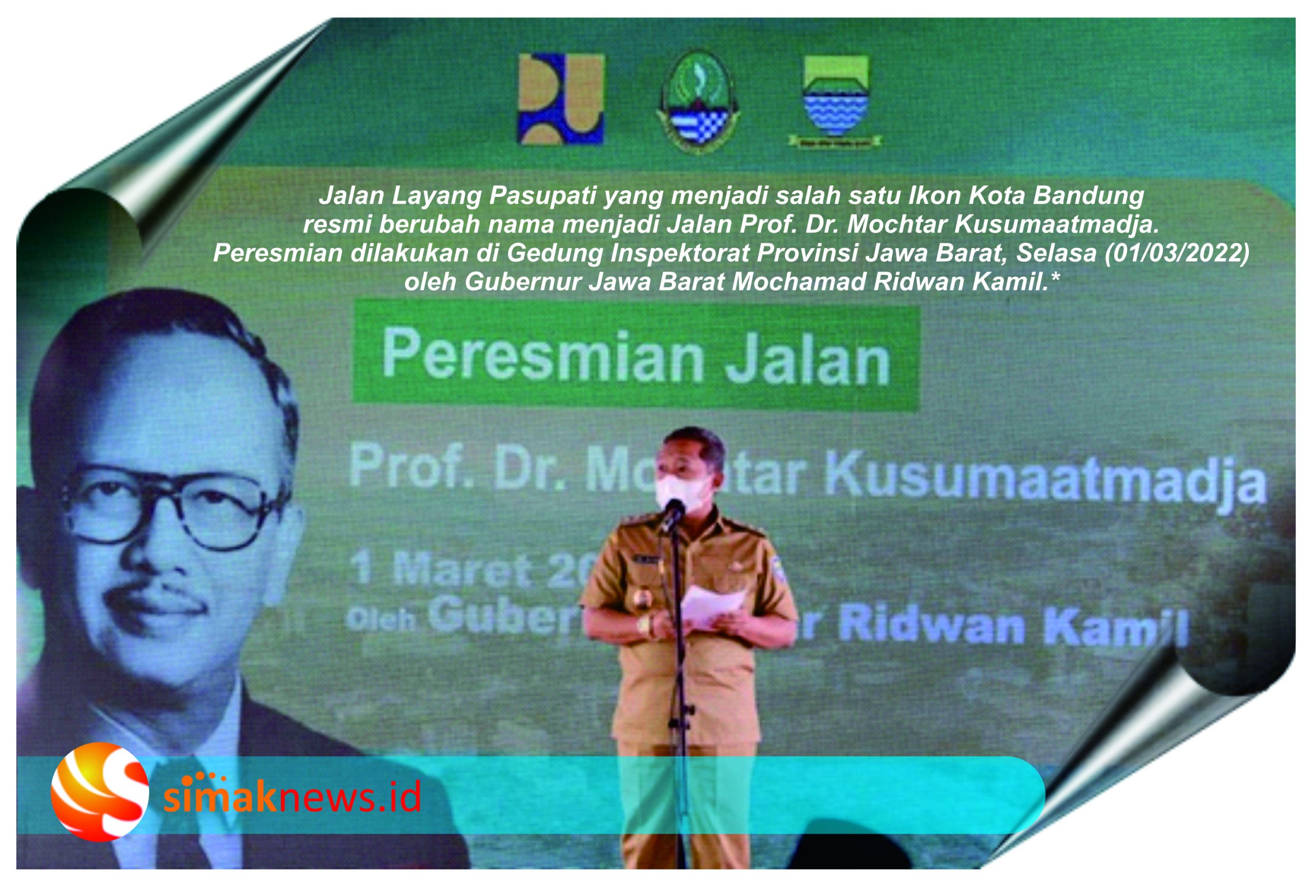 (KOTA BANDUNG), simakNEWS – Jalan Layang Pasupati yang menjadi salah satu Ikon Kota Bandung resmi berubah nama menjadi Jalan Prof. Dr. Mochtar Kusumaatmadja. Peresmian dilakukan di Gedung Inspektorat Provinsi Jawa Barat, Selasa (01/03/2022) oleh Gubernur Jawa Barat, Ridwan Kamil. Perubahan nama ini disambut positif oleh semua pihak, salah satunya Pemerintah Kota Bandung.